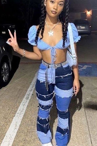 Pro Tip: The patchwork multi-tone jeans are the absolute star of this look. Their unique design is eye-catching. The blue ruffle crop top adds the perfect, playful balance.