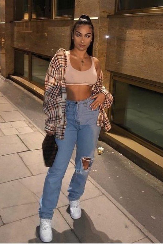 Description: This look is a classic, laid-back baddie ensemble. A simple nude crop top is a versatile base. It is layered with a classic plaid flannel shirt, worn open for a relaxed, layered effect. Paired with ripped light wash jeans and white sneakers, this outfit is effortlessly cool and comfortable.
