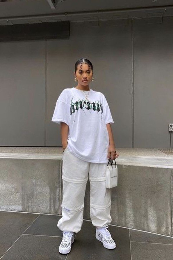 Description: This look is a cool, casual, and effortlessly stylish baddie ensemble. A classic oversized graphic t-shirt is a comfortable, personal staple. It is tucked into trendy white baggy pants for a relaxed, streetwear-inspired silhouette. White graphic sneakers complete this fresh, cool look.
