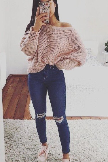 9. Pink Off-the-Shoulder Knit Sweater + Distressed Blue Skinny Jeans + Pink Sneakers