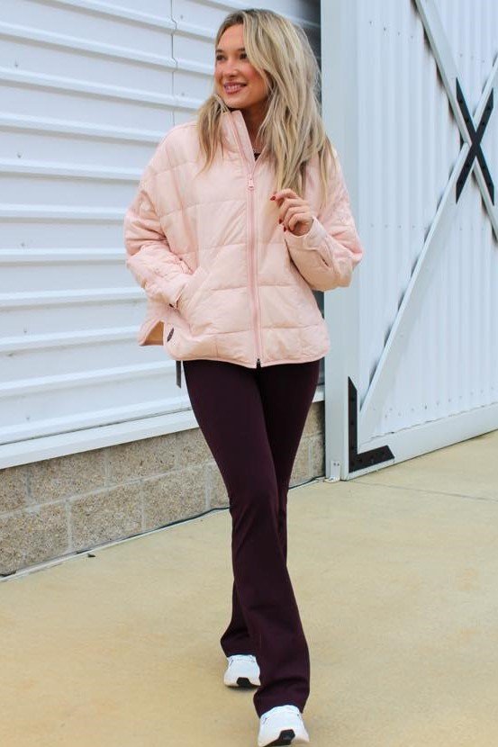2. Light Pink Quilted Puffer Jacket + Deep Plum Flared Leggings + White Athletic Sneakers