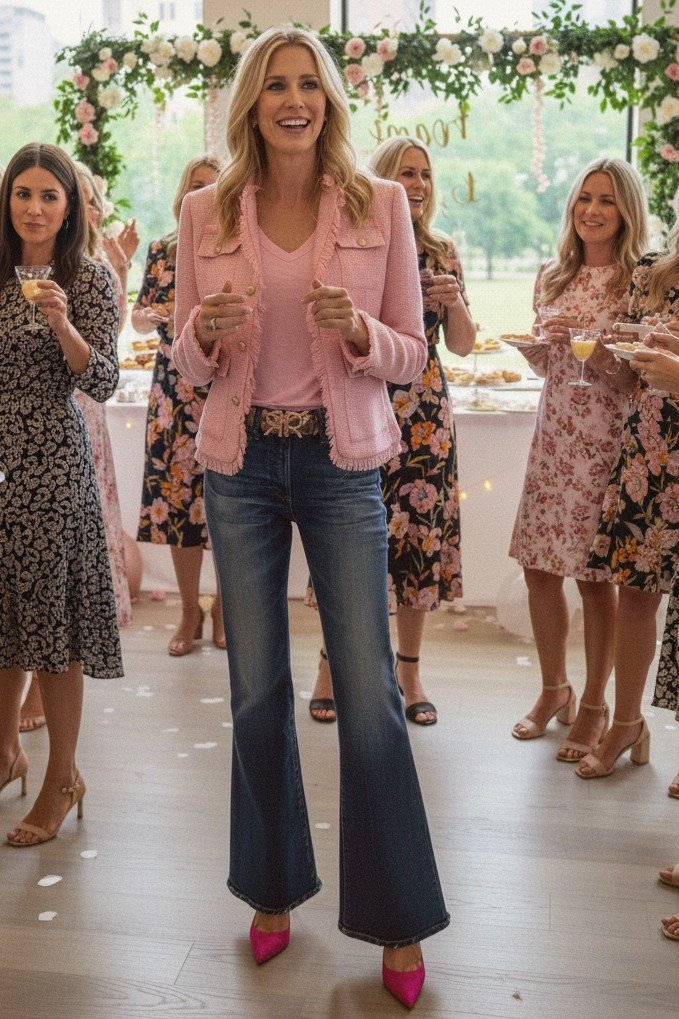 Description: This look is a chic, sophisticated, and respectful ensemble. A beautiful pink tweed fringe jacket adds a touch of texture and elegance. It is worn over a soft pink V-neck top. Paired with dark wash flare jeans and hot pink pointed-toe pumps, this outfit is polished and graceful.
