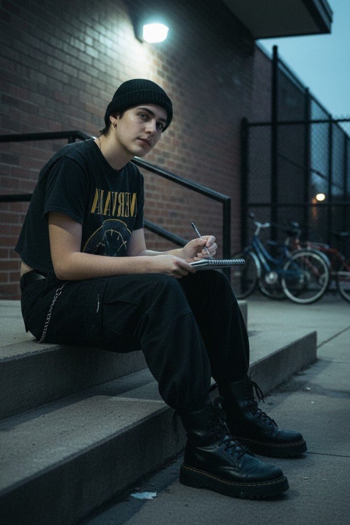 An edgy, uniform style look. A well worn band t shirt, tucked in or knotted, is the foundation. Pair it with loose fit cargo pants. A beanie hat adds a cool, casual accessory, and chunky shoes, like platform sneakers or Dr. Martens, finish the look.