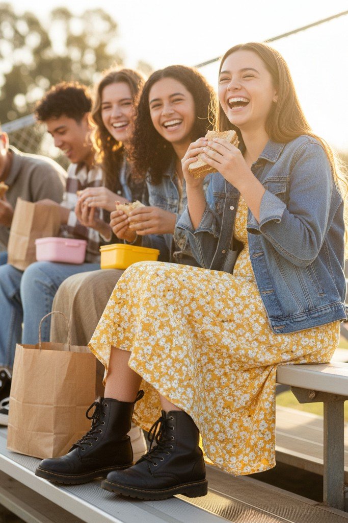 Why It Works: It is the perfect balance of feminine and tough. You are prepared for any temperature shift. This outfit transitions beautifully from day to after school.
