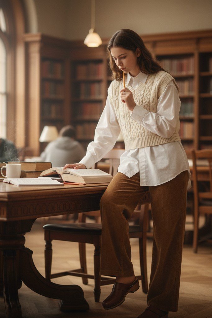 The “grandpa core” trend that is actually super chic. A chunky knit vest is layered over a crisp, oversized button down shirt. Pair with wide leg, tailored pants in a complementary color. Comfortable clogs add a quirky, European touch.