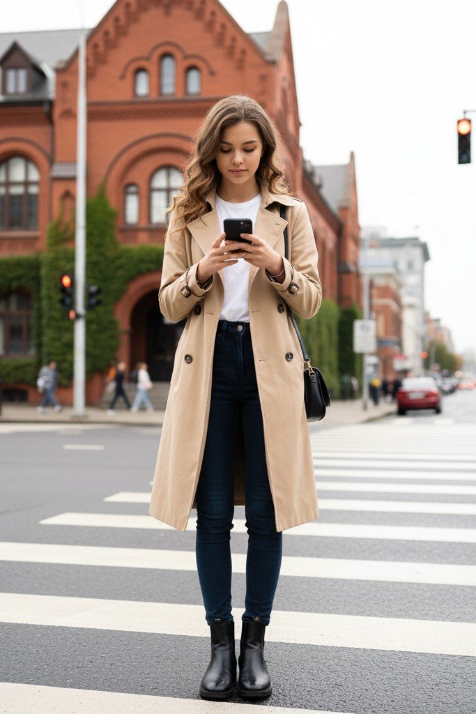 Pro Tip: Belt the trench for a more defined shape. Roll the jeans to show your ankles and boots. A simple tote bag completes the chic look.