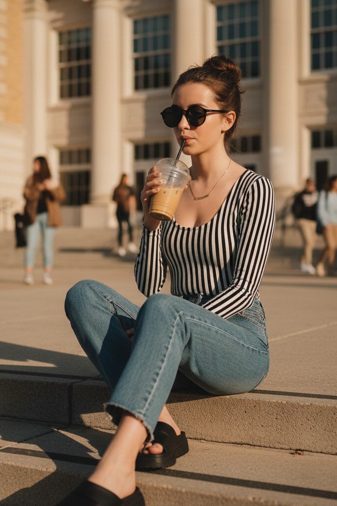 A sleek, put together look that is secretly comfortable. A long sleeve bodysuit in a solid color or subtle stripe creates a smooth base. Tuck it into classic, loose fit mom jeans. Platform sandals add height and a touch of 90s vibe.