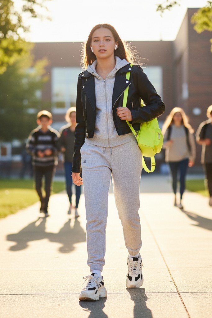 Elevated loungewear for the win. A coordinated sweatshirt and sweatpants set is the comfiest base. Throw a statement jacket over it, like a leather moto jacket or a colorful windbreaker. Chunky “dad” sneakers complete the high fashion athleisure look.