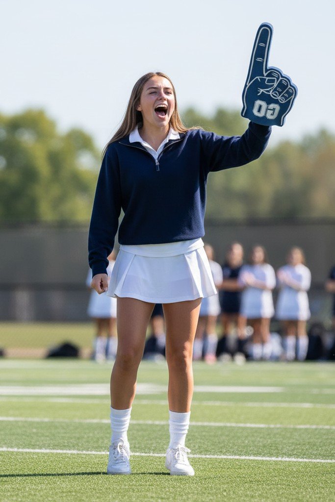 Pro Tip: Pop the collar of the shirt out over the quarter zip. The skirt should be a modest, sporty length. Pull the socks up to just below your knees.