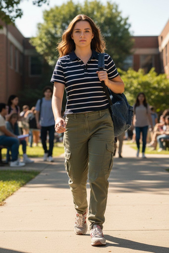 Preppy meets utility in this trendy look. A classic striped polo shirt, either fitted or slightly oversized, is the star. Pair it with loose fit cargo pants in khaki or black. Retro style running shoes in white or a bold color complete the sporty aesthetic.
