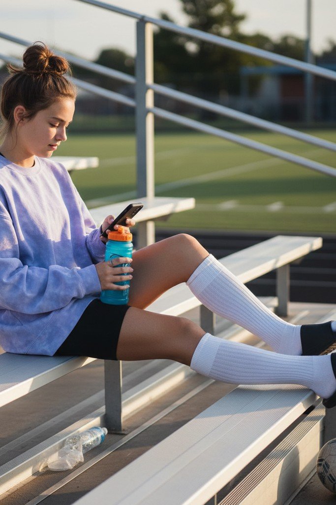 Pro Tip: The sweatshirt should be oversized. Make sure the biker shorts are a longer, athletic style. Pull the socks up high for the full effect.