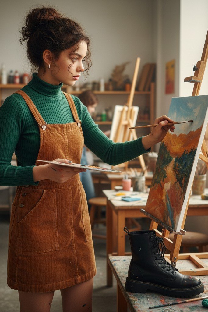 A trendy, almost scholarly look that is super cozy. A thin, fitted turtleneck in black or a pastel color is your base. Layer a corduroy or denim pinafore dress over it. Finish with a pair of chunky combat boots or platform boots.
