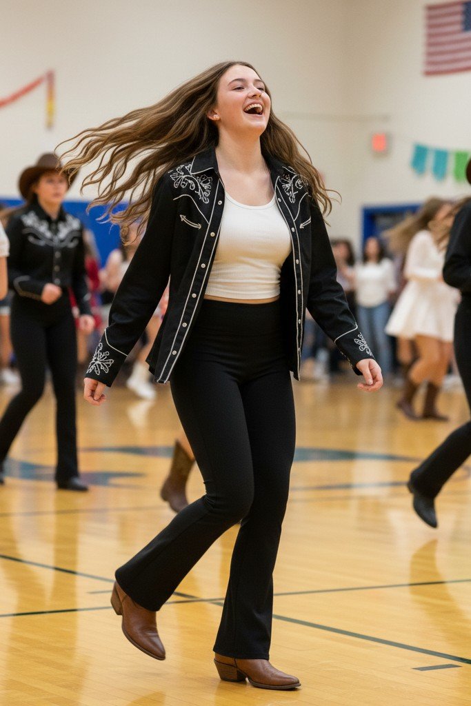 Pro Tip: Tie the western shirt at the waist for a cute detail. Choose boots with a lower, walkable heel for school. Add some silver hoop earrings.