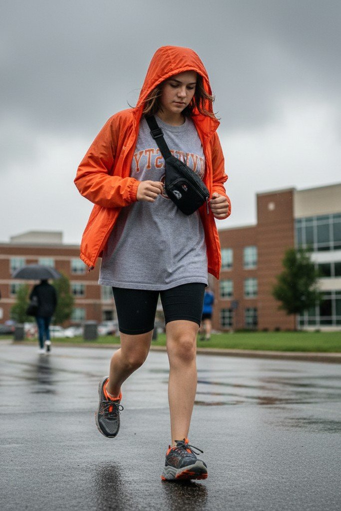 The ultimate practical, athleisure outfit for a drizzly or windy day. A bright, lightweight windbreaker protects you from the elements. Wear it over a combo of bike shorts and an oversized graphic tee. Running shoes ensure you can move quickly between classes.