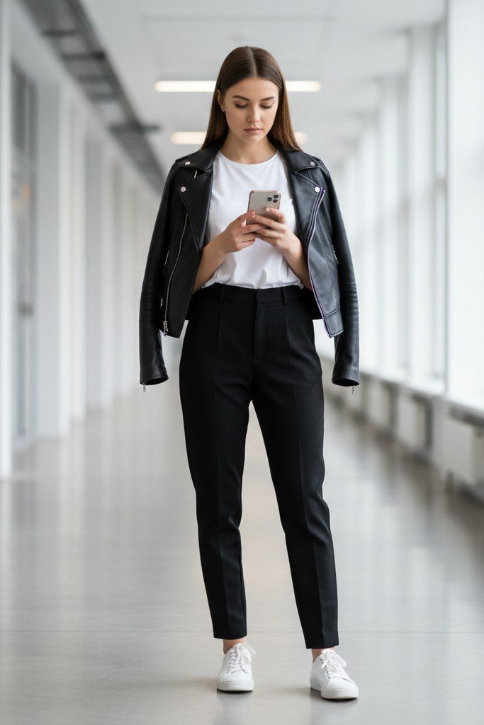 21. White T-Shirt + Black Trousers + Leather Jacket + White Sneakers