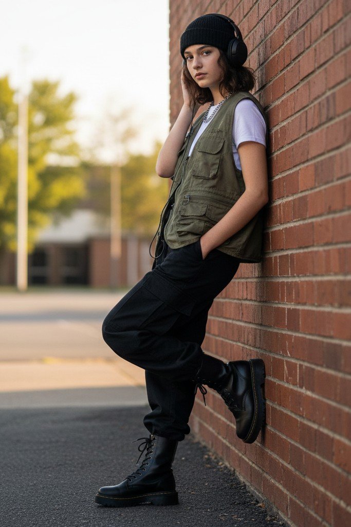 Why It Works: It is a relaxed outfit with a lot of personality. The vest is a unique layering piece. This outfit is perfect for someone who loves a grunge or streetwear vibe.