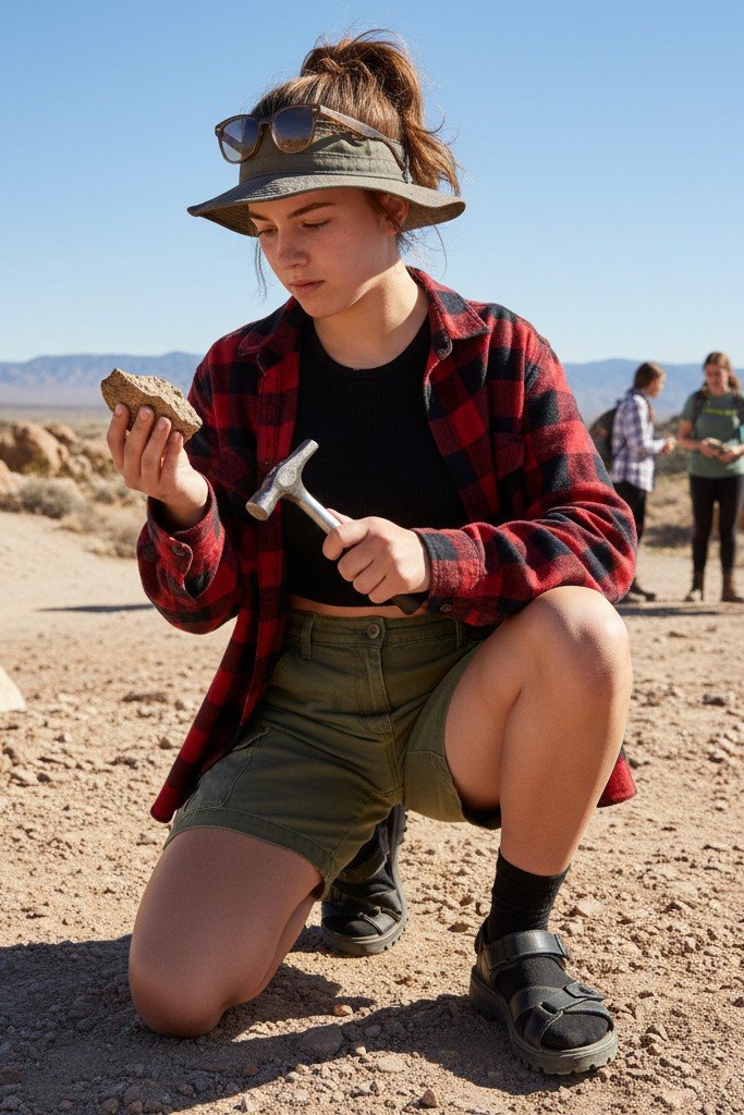 Utilitarian and trendy with a Y2K twist. Olive green cargo shorts with lots of pockets are practical and cool. A simple crop top is the base. An oversized button down shirt, worn open, is the perfect lightweight layer. Sturdy hiking sandals complete the outdoorsy, functional vibe.
