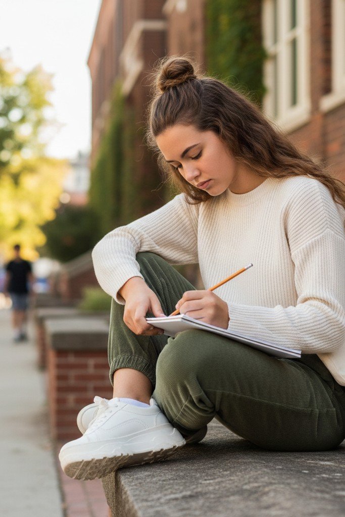 Why It Works: You get the comfort of joggers without looking like you are in gym clothes. The corduroy and cropped sweater make it look intentional. This outfit is perfect for a creative or casual school day.
