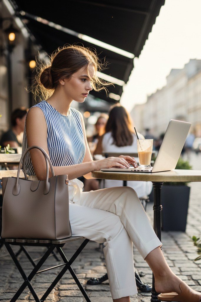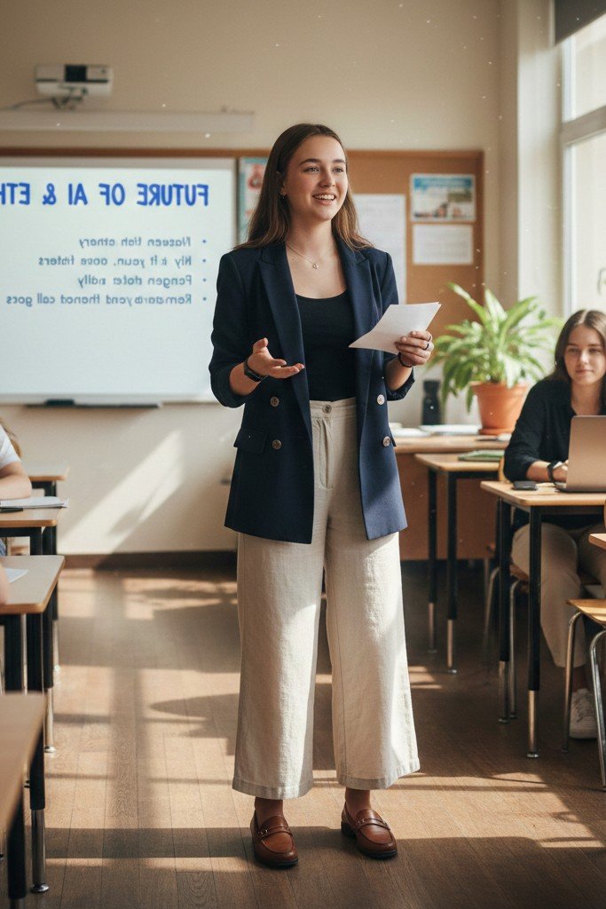 Crisp, clean, and perfectly professional for a school presentation. Wide leg linen trousers are breathable and elegant. A simple tank top is a sleek base layer. A structured blazer in a complementary color, like navy or tan, adds instant polish and sophistication.