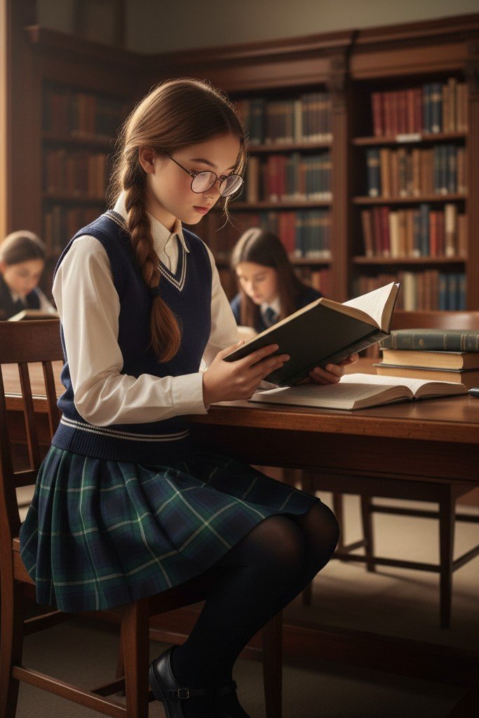 The ultimate scholarly, cozy look. A classic plaid skirt, knee length, is preppy and cute. A knit sweater vest is layered over a crisp collared shirt. Opaque tights keep your legs warm. Mary Jane shoes or loafers complete the storybook aesthetic.