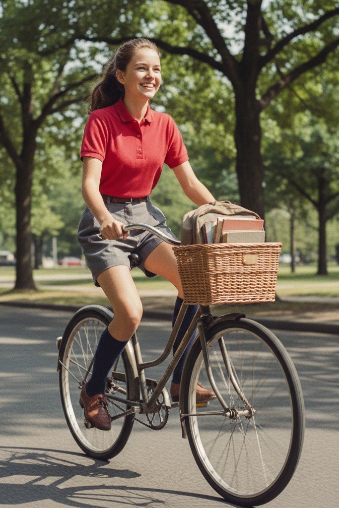 A retro, school uniform inspired look. Pleated shorts, often in a tartan or solid color, are preppy and cute. A classic polo shirt is tucked in neatly. Knee high socks, folded over at the top, add a collegiate touch. Loafers complete the scholarly aesthetic.