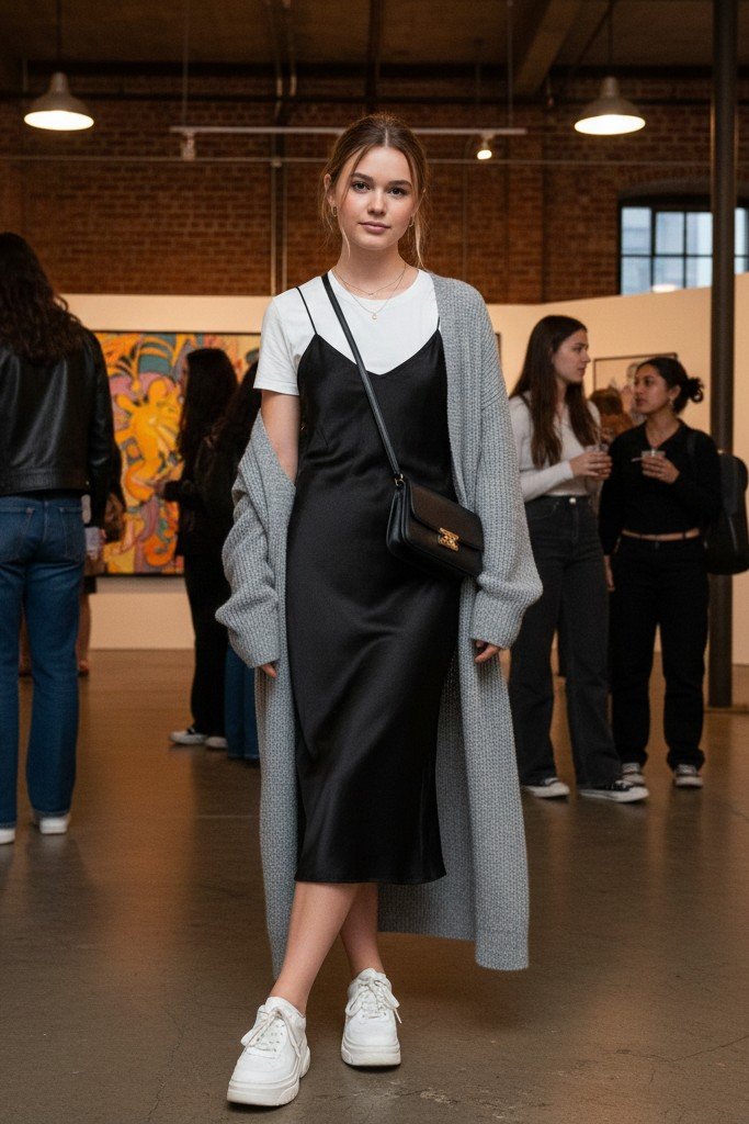 8. Slip Dress + T-Shirt + Cardigan + Platform Sneakers