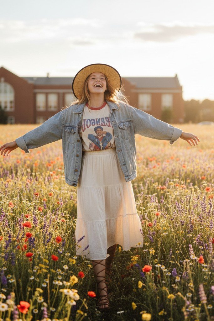 Why It Works: It mixes feminine and casual pieces perfectly. The denim jacket makes the skirt feel more daytime appropriate. This outfit is comfortable, stylish, and full of movement.