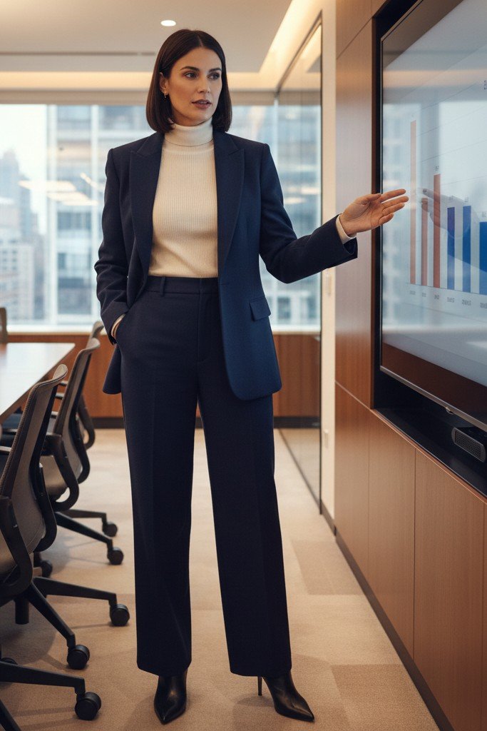 Pro Tip: Tuck the turtleneck into the trousers for a clean line. A silk scarf at the neck adds a pop of color and extra warmth.