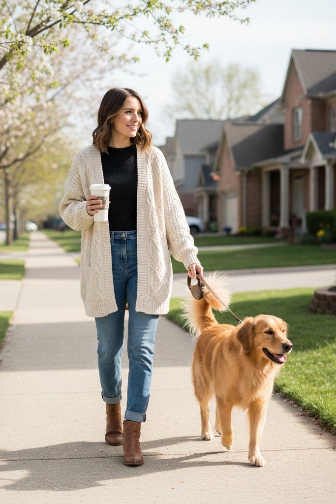 This outfit is a cozy hug. A big, oversized chunky knit cardigan is the star. Underneath, a thin, fitted thermal top in a contrasting color adds a base layer of warmth. Your favorite jeans keep it casual. Ankle boots or taller boots complete the grounded, warm look.