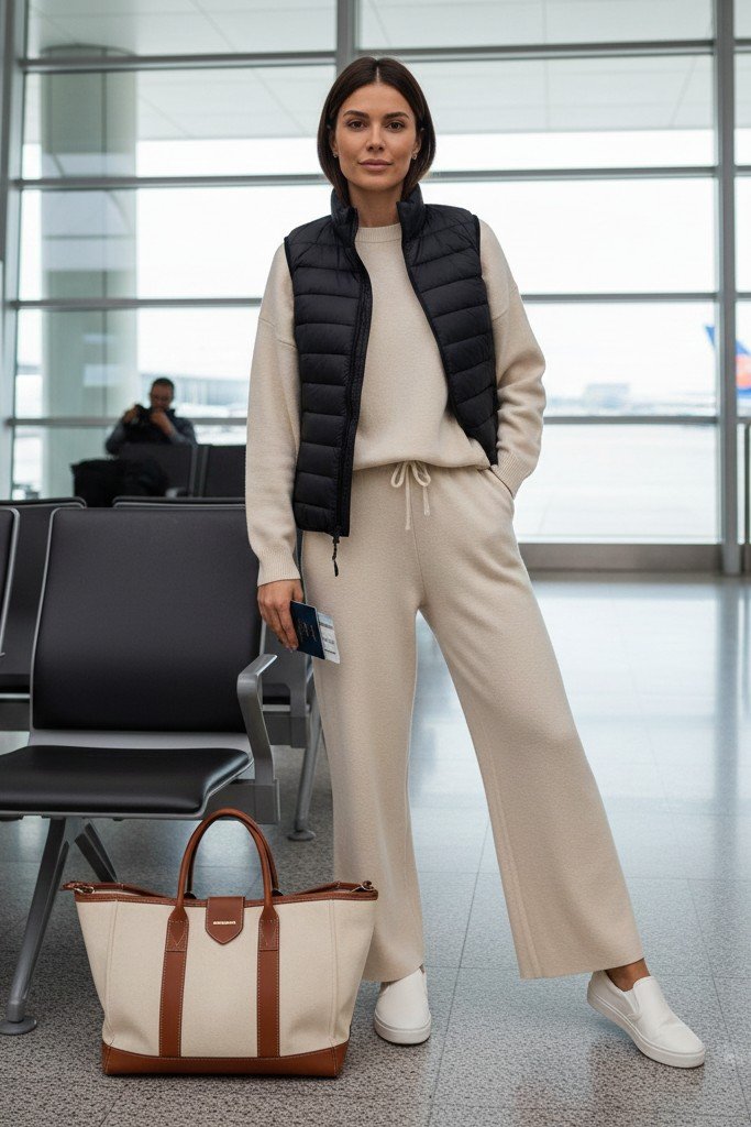 Warm and stylish travel day attire. A matching, thick knit lounge set (sweater and pants) is incredibly comfortable and warm for planes or trains. A packable puffer vest or jacket can be stuffed in your bag but provides core warmth when needed. Easy slip on shoes or sneakers are practical.