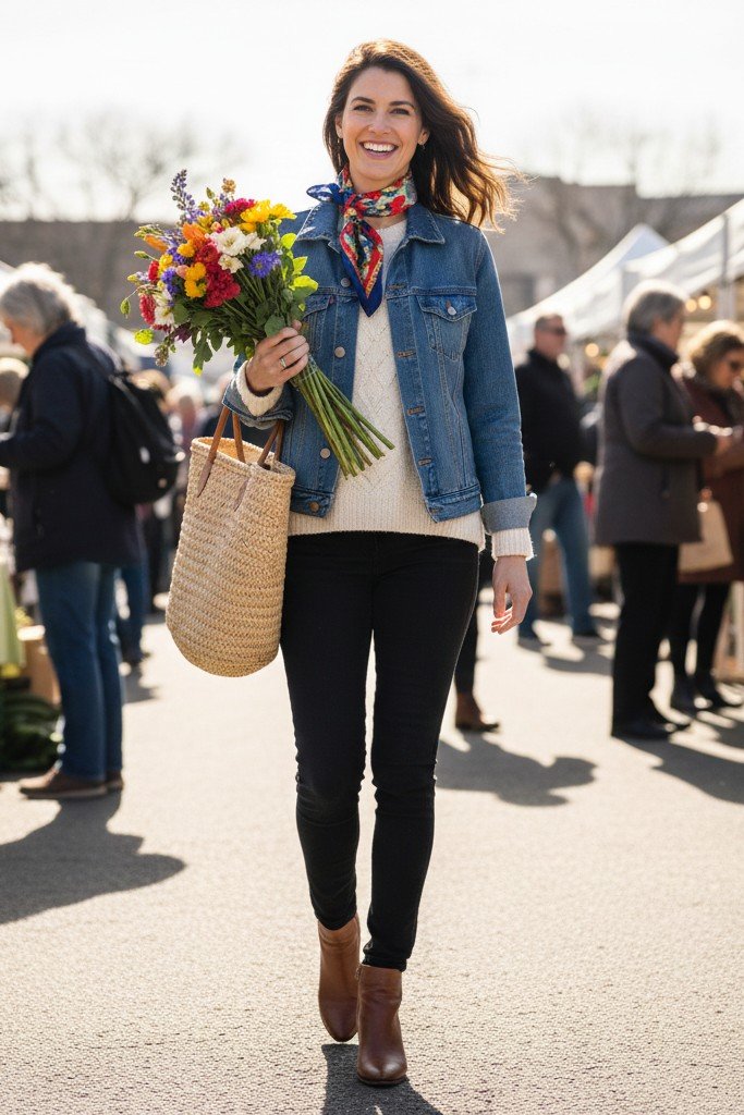 A layered classic for cool, not cold, days. A medium weight sweater is your main insulator. A denim jacket adds a wind breaking layer and style. A light scarf provides neck warmth and a pop of color. Jeans complete the casual, put together look.