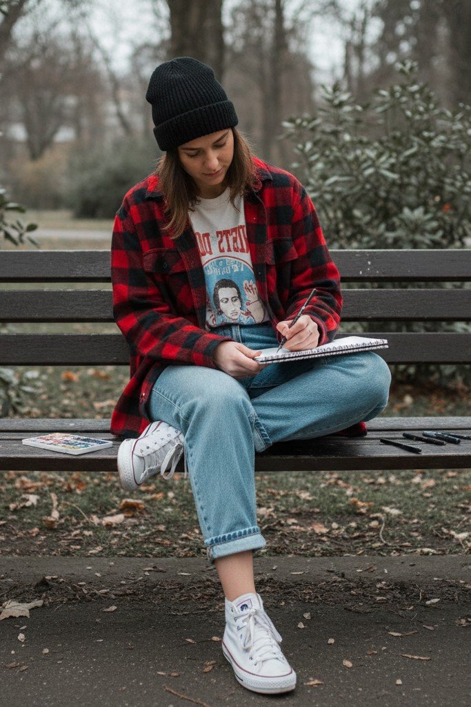 Layered grunge inspired warmth. A soft, checked flannel shirt is worn open as a light jacket. Underneath, a simple graphic tee adds personality. Pair with your go to jeans. A slouchy beanie pulls the look together and keeps your head warm on breezy days.