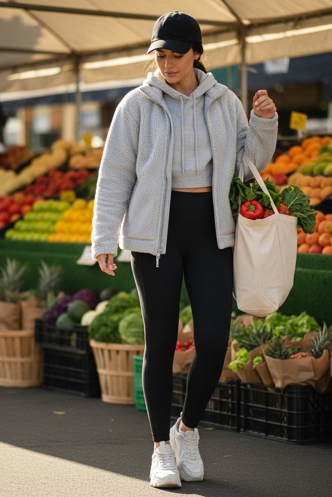 Pro Tip: Half tuck the hoodie into the leggings to show you have a waist. A beanie and crossbody bag complete the athletic vibe.