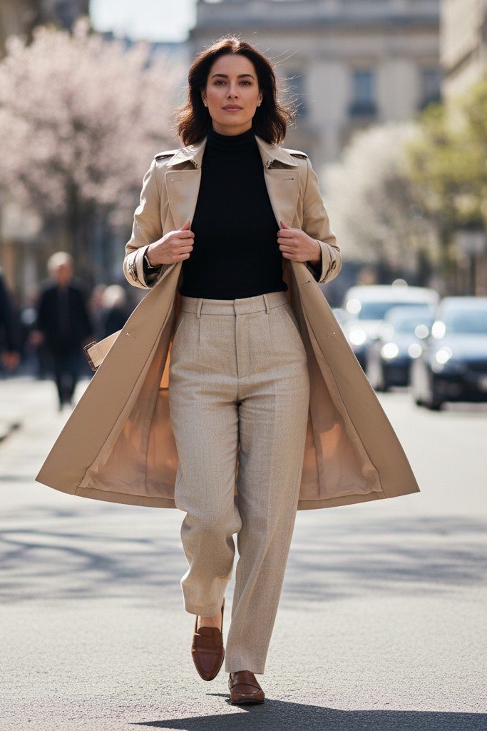 Sophisticated and timelessly warm. A belted trench coat is the ultimate spring outer layer. Underneath, a sleek turtleneck knit dress provides full coverage and warmth. Opaque tights add a crucial layer for your legs. Polished loafers keep the look professional and comfortable.