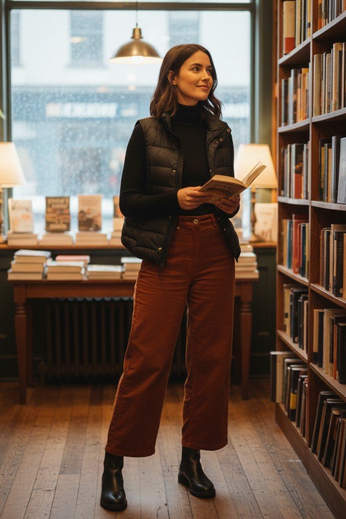 A masterclass in texture mixing. A fitted turtleneck sweater in a solid color is your warm base. Wide leg or straight leg corduroy pants add a rich, tactile texture and keep your legs warm. A lightweight, sleeveless puffer vest provides core warmth without restricting your arms.