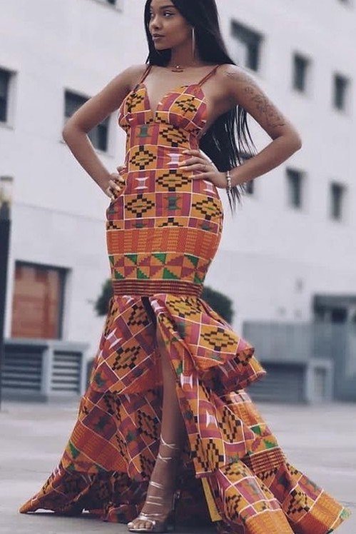 Why It Works: This gown is perfect for the most formal of occasions, like a traditional wedding or a milestone celebration. The Kente cloth is rich in cultural significance, and the ruffled mermaid silhouette is incredibly glamorous.