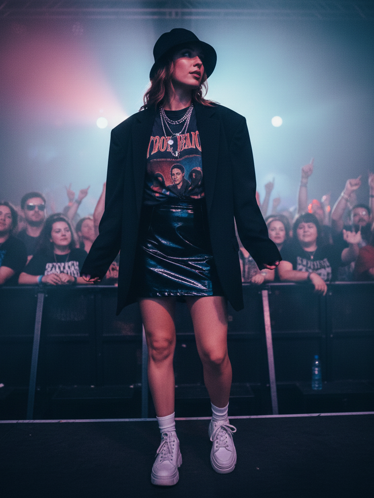 Description: A vintage band t-shirt is knotted at the waist or tucked into a black faux-leather mini skirt. Footwear is sturdy combat boots or heeled ankle boots. A classic black moto or biker jacket completes the rock-and-roll look. Messy hair and bold lipstick are the final touches.