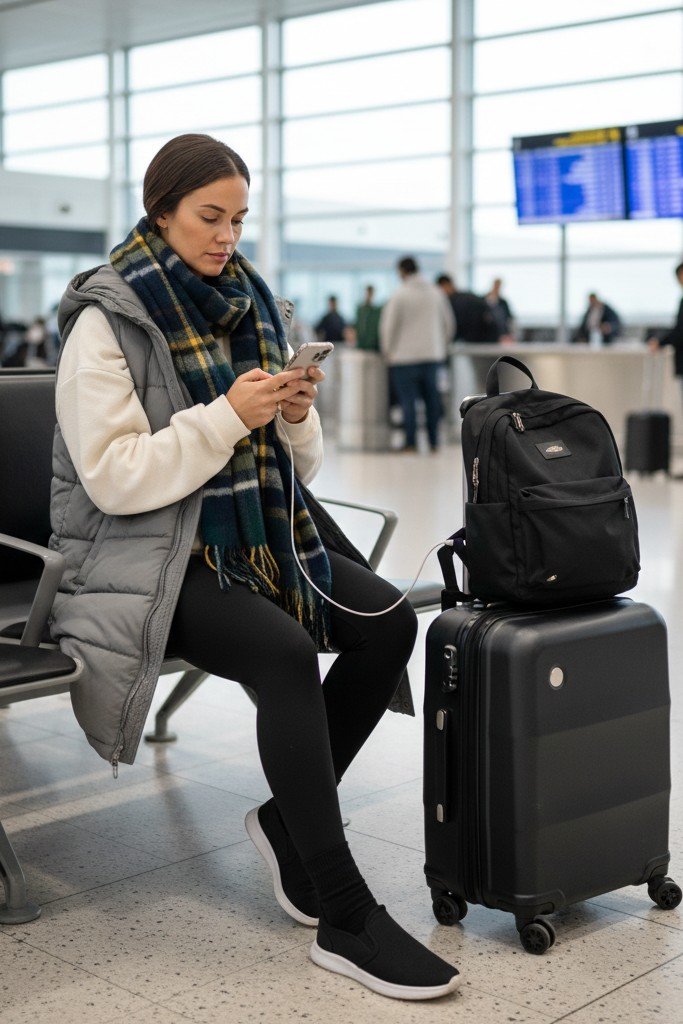 Why It Works: This is the ultimate comfort-forward travel outfit. It’s cozy enough to sleep on a plane but looks pulled-together. The vest is perfect for the unpredictable temperatures of terminals and airplanes. Everything is easy to move in.
