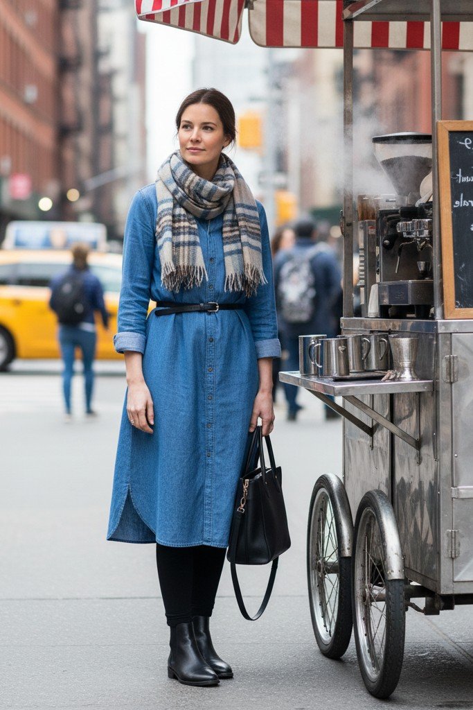 Description: A long-sleeve, button-front shirt dress in a midi length, made of a medium-weight cotton or chambray. It’s worn over opaque black leggings or thin thermals for warmth. Footwear is flat, black leather ankle boots. A belt cinches the waist, and a scarf adds extra style.