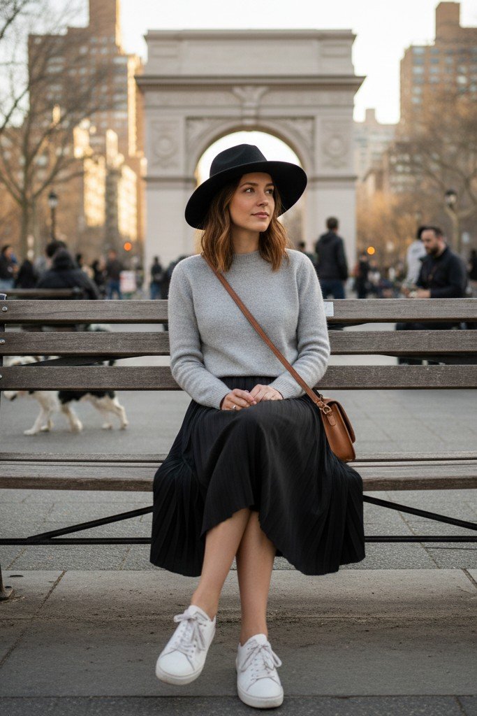 23. The Effortlessly Chic Tourist: Midi Skirt + Sweater + Sneakers + Hat