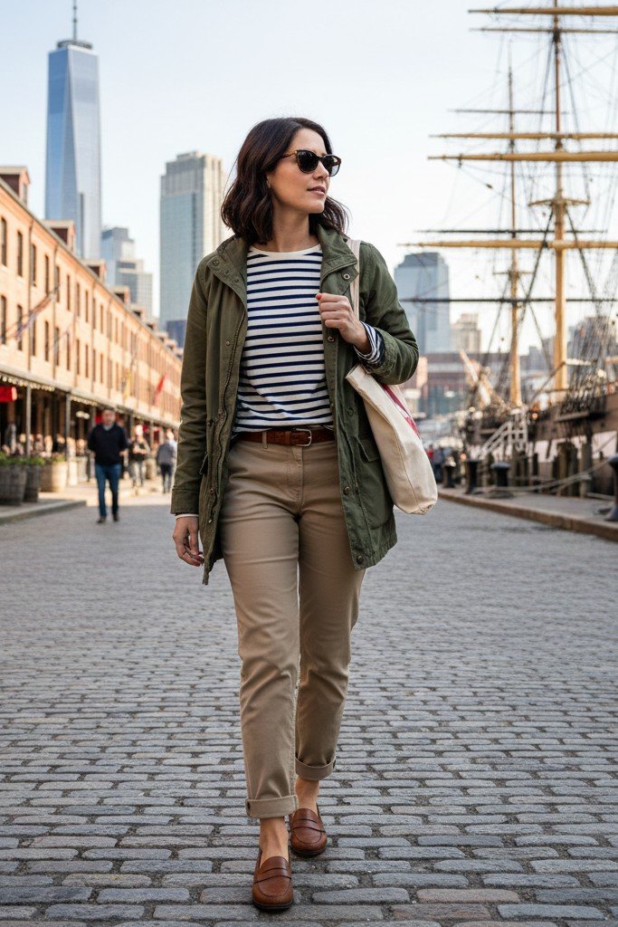 24. The Smart Casual Day Trip: Chinos + Breton Top + Field Jacket + Loafers