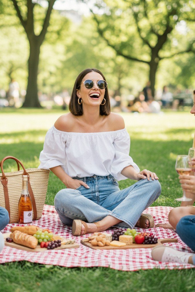 Description: A cute, off-the-shoulder or puff-sleeve top in a light color or gingham print is paired with high-waisted, wide-leg jeans. Shoes are classic rope-wedge espadrilles. A straw bag and oversized sunglasses complete the sunny, relaxed look.