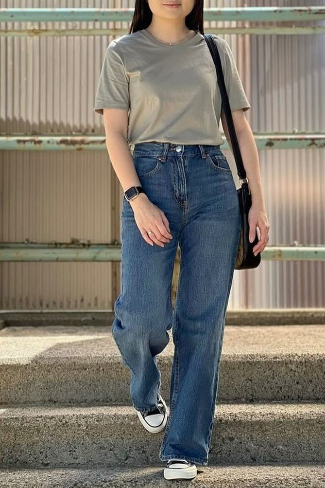 Why It Works: This outfit is perfect for a warm day. The fitted tee balances the volume of the wide-leg jeans.