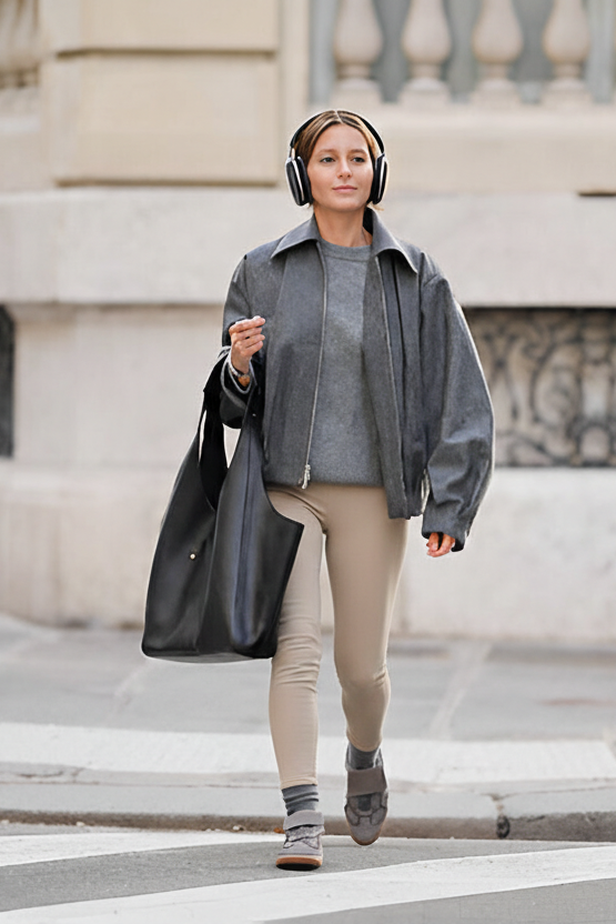 A layered, tonal look with cozy textures. A grey wool bomber jacket is a classic, stylish layer. A matching grey knit sweater adds warmth. Beige leggings provide a soft, contrasting base. Grey socks and sneakers tie the top colors together.