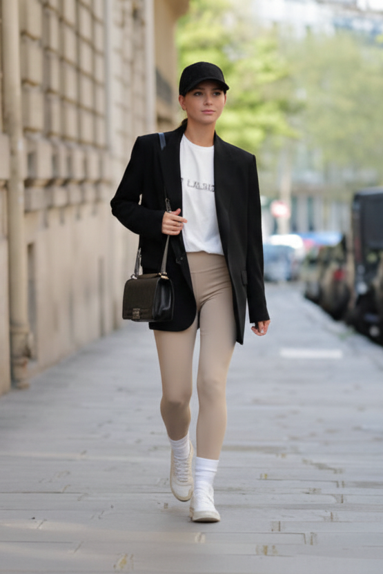 The ultimate smart casual uniform. An oversized black blazer adds instant polish and structure. A white graphic tee keeps it cool and personal. Tan leggings and white sneakers keep the look fresh and modern.