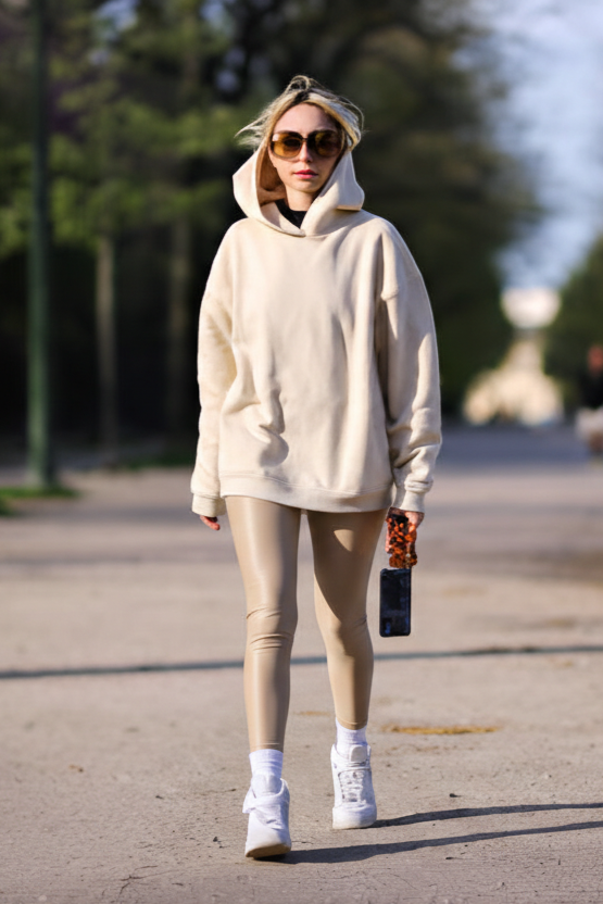 The ultimate in tonal, cozy comfort. A matching beige hoodie and legging set is effortlessly chic. White sneakers keep the look fresh, clean, and bright. This outfit is pure minimalist bliss.