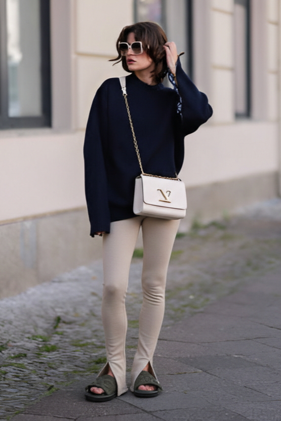 2. Oversized Navy Sweater + Tan Split-Hem Leggings + Green Slides