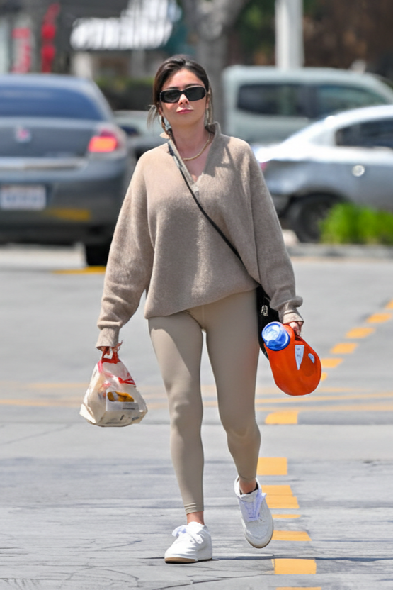 Cozy, tonal, and effortlessly elegant. An oversized taupe sweater is soft and sophisticated. Matching tan leggings create a beautiful, monochromatic silhouette. White sneakers keep the look fresh and modern.