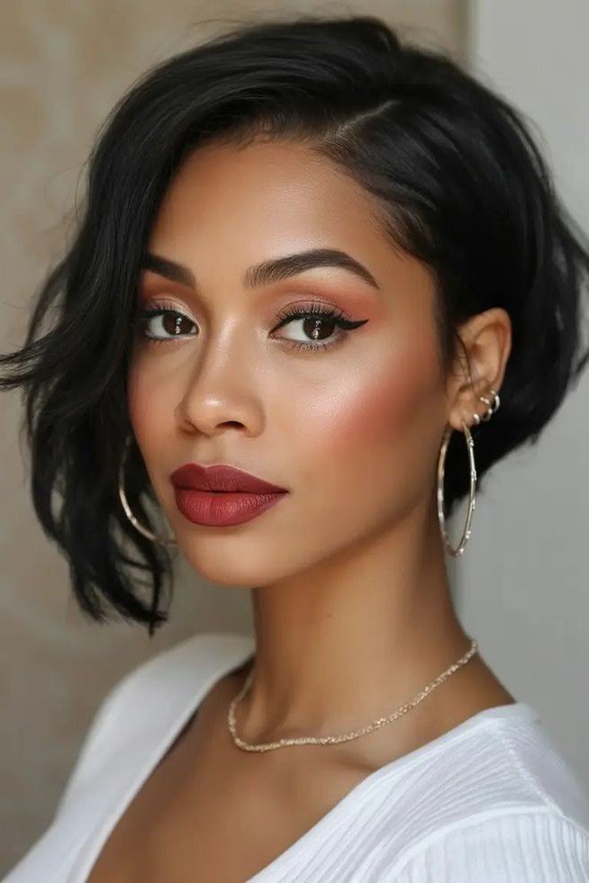 Why It Works: The jawline length is incredibly flattering for round or square faces. The side sweep adds height and drama at the crown. This cut works beautifully on relaxed or pressed natural hair. It is perfect for date night or girls night out.