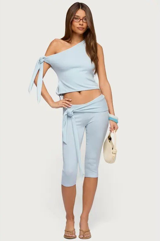16. Light Blue One-Shoulder Tie-Detail Top + Matching Light Blue Capri Leggings + Tan Thong Sandals